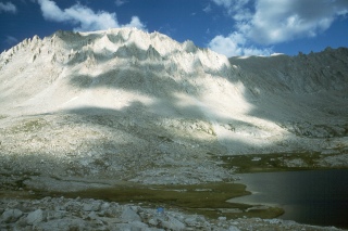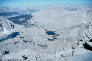 George's Story: Part way up, the trail coming up from the Bishop Trailhead came through a narrow pass from the east and soon there were other hikers heading up the trail. It is a well established challenge for strong hikers in the Sierras: Climb the entire 12 miles and 6000 feet from the Bishop Trailhead to the peak and return in one day. Some of those hikers seemed to regret having accepted the challenge, but many were still going strong when they reached the top. One lady seemed especially strong near the top. She was very large and tall, with a Scandinavian appearance that featured long blonde pigtails, and she had made the climb in record time. Near the peak, the trail degenerated into a scramble over large rocks. In fact, the entire, broad peak was a huge pile of rocks and all of the walking consisted of stepping from rock to rock. On the east side of the broad top, there was an area about ten feet higher that seemed to be the actual peak. From it, one could look almost straight down on the eastern side of the mountain where there was a brilliant green lake. About fifty yards west of that peak area was an old stone building that could have been a former weather station, and about 100 yards west of that was an open-air privy. The privy had a board partition that screened the user from the view of others on the peak, but the seat provided a magnificent view of the Sierra Range to the west.