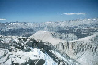 It was a thrilling moment to reach Mt Whitney's summit! It had taken about 4 hours to make the climb. We missed Roger. I know we were there by noon. The top was as large as a football field and relatively flat, with a 20-30 degree slope with the high point at the East side. It was mostly rocks with some larger boulders. There were so many people there that George and I were surprised. There was a brilliant blue sky, bright sunshine, and fabulous views of mountains in all directions. It was such an exhilarating feeling. It was difficult to breathe and I felt giddy and whoosy but not nauseated. It was hard to think straight. On the East, you could sit right "on the edge" and look down forever. There was a small low building with a ledger where you could sign your name and hometown.