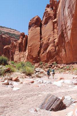 OK, so two outta three ain't bad. The point I had decided looked like the best place to camp (based on the topo map, guide book, and Google Earth) is near an old line cabin on a bench on canyon right, a few hundred meters after the point where water starts to flow in Horse. For those of you who like to be a bit more exact about places, the GPS waypoint is 12S, 477158 E, 4177175 North. (Note that as usual, all the waypoints I report in this write up are in NAD27 coordinates, to maintain compatibility with paper topo maps.) We pulled into camp at about 3:30 pm, slowed from the heat. The campsite did have lots of grass, and some highly needed shade, but no spring on the bench. At least, none that any of us could find, and we looked. Hard. But no matter: The point where water started to flow was only a couple of hundred meters above camp, and you could tell, by the green fuzz growing on the side of the flow, that this was permanent water. It looked like a spring, tasted like a spring and was certainly sufficiently cold to be a spring. It is just that it was flowing from the side of the canyon floor. Hey, it worked for me.