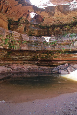 Less than 250 meters above the campsite, we finally came to the blocking pouroff. I tried taking a GPS reading, but it was impossible to get more than one satellite. The walls are high and straight, but I estimate that the pouroff is near 12S, 608710 E, 4142702 N. The pour off may be 30 to 40 feet high, and has a large pool right below it. The neatest thing is that there is a large hole, making what is technically a natural bridge, worn into the floor (or top) of the pouroff. It is reminiscent of the big hole in the Golden Cathedral in Neon Canyon in the Escalante system. We tried taking photos, but the lighting was extremely difficult. We found a couple of rocks to sit on and had some welcome lunch. It was way past due. Afterwards, we took the opportunity to load up on semi-potable water (we treated 4.5 liters) and left the lunch spot sometime around 1:30 pm.