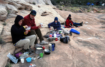 It was a pleasantly cool evening, and most of us prepared breakfast swathed in heavy PolarTec. Will had gone out making yet another attempt to locate the wayward rope. He had been carrying it with him during his many attempts to find a route into the South Fork from the north side of canyon. He laid it down for a bit, and simply could not find it again when he went to look for it. He felt really badly, but no one could accuse him of not trying to find it. He knew that not having the rope might limit our ability to get into the North Fork and I think that such was one reason he was looking for it so diligently. But sometimes, extreme diligence does not count for much. So we departed camp a few minutes after 9 am, ropeless, and took about an hour or so to get back to the split. But the discussion was still not over. Will wanted to follow the route that I had interpreted from Kelsey's map. However, I had put in that route prior to reading the description of a route from the Canyoneering book that covers this area. In such, there is a mention of how the canyon (North Fork) "ends" at 6005 feet elevation. "Ends" sounded too much like a major pour off for me to be comfortable with coming in above it. So we decided to put some waypoints near the spots where we thought the Canyoneering 2 book illustrated an exit route, and headed off to find those spots.