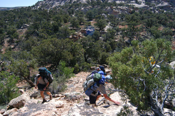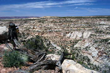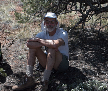 We could look down to the north, and see delightfully large pools of water in the bottom of Bowdie, but it was not apparent as to how to get there. Sue and Cliff took off, and tried to find a spot that went down to the bottom about 200 - 300 meters to the NW of where we were resting in the shade. Both of them disappeared for a long time, and reappeared a few hundred feet below us. I could see them working back toward our direction, where there seemed to be a promising band of rock that might enable descent. But then we saw them shake their heads and turn around, and I knew things were not looking good. When they returned after 45 minutes, we all did an assessment of our water situation. Most of us only had a liter or so left, and we knew at the rate that the low humidity was wicking the water from our bodies that our remaining time would be short. We decided to make one last push, and move to the spot where the Canyoneering book showed an exit route. I was not optimistic, but felt like we had to keep trying. The crew moved out to the NNW around the edge of the escarpment about another 20 minutes, until we came to a spot near 12S, 582148E, 4199000 N. About 150 meters to the north was to be the spot where the Canyoneering description indicated an exit route. John and I dropped our packs and went out to look, but there was just nothing that looked sufficiently promising to warrant a go-for-broke descent attempt. We knew that Cora's knee was giving her fits (why she had decided to push on for the second canyon was not clear, but then we all make decisions based on different values), we were close to being out of water, and I think psychologically, we were beaten. Time to live to fight another day.