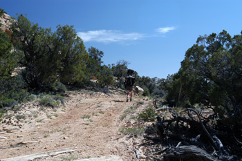As we rounded the escarpment to our west, I recall making a mental note that, in the future, prior to covering truly unfamiliar territory, I should not rely on a preconceived mental image of how the terrain should look, but rather look at it on Google Earth, so I could get a more realistic image in my mind. The terrain to our west looked from a topo map merely to be a rounded rise. But when you get there and look at it, escarpment is the word that comes to mind. We spent about 90 minutes carefully working our way to the north, targeting a spot on the canyon rim just downstream of the point labeled 6005T on the map. When we got there, it was clear to me that we had done the right thing. Susie immediately pointed out a huge pour-off (well, you could not actually see the pouroff itself, but you could look upstream and see the canyon floor, and you could look downstream and see the canyon floor, and figure that in between, there had to be a huge elevation loss). The challenge of route finding in this country was highlighted by Will's initial insistence that the canyon we were looking at was a side canyon of the main North Fork of Bowdie. I got a bit frustrated because it seemed hard for Will to believe the GPS. In my usual tactful manner, I yelled at him: "Goddam it, Will, I took a fuckin' waypoint at the spot we are standing, and we are 300 meters west-northwest of the spot labeled 6005T. I KNOW where we are, and we ARE NOT lookin' at a goddam side canyon." My frustration and shortness of temper were rising with the temperature.