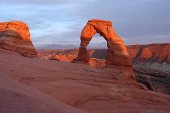 We ran into the rest of our crew during our first day at Arches, and they ran into Ray that evening in Moab, so he came out to our campsite and chatted for a while. His cold seemed to be waning, and he was suffering less from the frustration of an aching hip. Our second day in Arches held something special for me: we had decided to eat dinner early, and hike up to the Delicate Arch overview and watch the sunset. The weather was not particularly cooperative, but the sun eventually dipped below the cloud deck, and offered of few minutes of gloriously pink lighting, a high note on which to end the trip.