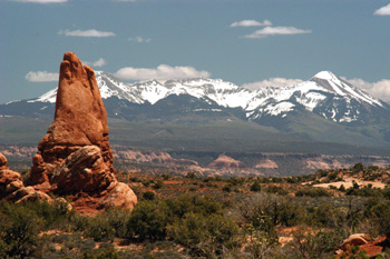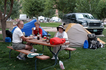 Ah, to be "stranded" in southeastern Utah with time to kill. The possibilities are endless. Sue and Andy and Susie and I had pretty much decided to head up to Moab and Arches National Park for a couple of nights. Lance and his crew thought that such would be a good idea too. See-everything-there-is-to-see Will, along with Ron and John, decided that they might take a day trip to Moab, but arranged for a float trip on the San Juan for Sunday. Barbara thought she would join the Moab crew, so after a stop at the Blanding laundromat (Sue smiled at the proprietor so he would let us in before the normal opening time), eight of us headed for Moab. It has changed big time since I first saw it over 25 years ago, but so has a lot of America. We found a campground just outside the entrance to the park, with, thankfully, green grass upon which to pitch tents, and HOT SHOWERS. It was a far cry from wilderness, especially in the middle of the night with the trucks roaring by on the highway, but the wine and beer flowed, and it was a good jumping off spot to see some of Arches. Most everyone in our 8 person mini-caravan had never been there before, and for me, 25 years' passage was enough for me to call it nearly new.