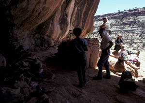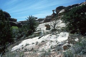 Anyway, we moved up the canyon another mile or so, and saw another path leading up to the west wall. We decided to follow it, and were treated to a nice batch of ruins, with a well preserved roof on a dugout room. Not a kiva, because it was not circular, but in pretty good shape. Lots of pottery shards around. We continued up canyon, and around noon time, heard some of our crew yelling to us. They were several hundred feet above the canyon floor, under a large overhang. Turns out that they had found the so-called perfect kiva. It took us 15 minutes or so to climb up, and we were rewarded with nice shade, and a cool kiva to explore. The roof was perfectly intact, and someone had reinforced the ladder leading down into it, so you could climb down safely. I took a few pictures, and enjoyed a shady lunch. I think everyone except W&B was up there. After lunch, we climbed down, and headed up canyon for a ways. We found a big cairn in the creek bed, pointing the way around some huge pour offs, which Susie and I never actually saw. I could not determine if this was for Access # 1, or 2, but you would have to do some major work to get in here.