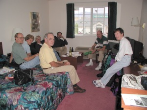We caught up to Ray and George in Winthrop, miraculously, just as they were pulling out of the place that they had eaten there, and continued to Omak, arriving just after Tim and Diane. There was the usual round of hugs and handshakes, and introductions, since George had never met our friends from Tucson. Since Andy and Sue were due to arrive at the motel at 6 pm, "cocktails" - consisting of more wine and the remaining cheese and smoked Salmon - seemed to be in order by 5:30. After lots of wine, even the sprinkles outside didn't seem so bad, but I had the sense that it was snowing at the higher elevations. By the time A&S arrived, the salmon was just about gone, but they did get a couple of bites. It was off to dinner, at the Whistler Family restaurant next door, where nearly half the crew seemed to go for the grilled chicken or shrimp Caesar Salad. The impending lack of fiber seemed to be on everyone's mind. There was a sense that everyone was trying to be as upbeat as possible, despite the forecast. The optimism wasn't catching for Susie.