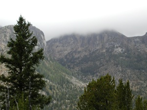 George and Ray got ahead of us, and out of sight near Newhallem, and after getting behind the RV Caravan from Hell, we decided to stop for lunch near Wahington Pass, in the shadow of Liberty Bell (if there had been any sun). At the elevation of the pass, it was, in a word, nippy. Susie and I dined - to the extent one can "dine" when they are crammed in into the front seat of a rental car - on smoked King Salmon, some wonderful sourdough bread, Tilamook cheese, and a nice Merlot. We sat in the car because of the temperature. I tried to be optimistic, imagining that the clouds were getting thinner as we headed east. It was a bit of a stretch.