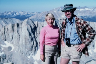 It was a thrilling moment to reach Mt Whitney's summit! It had taken about 4 hours to make the climb. We missed Roger. I know we were there by noon. The top was as large as a football field and relatively flat, with a 20-30 degree slope with the high point at the East side. It was mostly rocks with some larger boulders. There were so many people there that George and I were surprised. There was a brilliant blue sky, bright sunshine, and fabulous views of mountains in all directions. It was such an exhilarating feeling. It was difficult to breathe and I felt giddy and whoosy but not nauseated. It was hard to think straight. On the East, you could sit right "on the edge" and look down forever. There was a small low building with a ledger where you could sign your name and hometown.