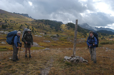 After Ute Lake, the CDT begins to climb steadily. Not really steeply, but steadily to the southeast. Our goal was Gunsight Pass. Realizing you are officially at Gunsight Pass can be a challenge coming from the direction we were. As near as I could determine, Gunsight Pass is in a bit of an opening immediately southeast of a small knob marked 12,444 (286,113E, 4167884N). At first, we were not sure that we were at the pass. Then, we all started to move forward and I realized that Tim and Diane, in front of us, were starting to descend. I knew that was the wrong way, because the description of the CDT indicates it slabs around to the north and constant elevation, more or less until it starts to descend to the saddle at 12,043 feet (287,647 E, 4169,459 North). So we went back and tried to figure things out. I took a GPS reading to confirm (or perhaps, figure out) our location. While I was doing so, I looked down on the ground, and saw that a piece of heavily weathered wood lying on the ground was in fact, if you looked carefully, a CDT sign. So much for good signage, and additional justification for carrying a GPS. All this frogging around had cost us precious time. Not that we were in a hurry, but it was clear that the weather was not improving. By the time we left Gunsight Pass, it was 11 am.