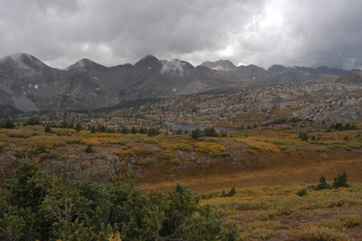 The climb up out of the saddle is fairly steep for the first 400 feet and takes a bit of time. But it too passes, and the grade slacks off about a kilometer SW of the next saddle (marked 12, 617) and becomes a climbing traverse. We felt pretty exposed, especially with thunder audible to our northwest. OK, it was more than audible: I found myself counting the seconds between the flashes and the booms. The sky was pretty threatening, and I kept thinking to myself, you know, you would think I would not be plagued with the same sort of thunderstorms, hiking in a different season, at a different time of day, than I was 24 years ago. Alas, some things never change. Anyway, it took us 45 minutes to make the saddle, which we did with wind, sleet, and threatening thunder (but the lightning never got closer than a mile or so). Motivated by the weather, we made it to what the guidebooks call this little pond below the Window as Opal Lake. As seems to be the pattern, the maps do not show the trail correctly. In fact, the CDT descends and makes a slight turn to the NW, coming alongside the east side of Opal Lake. On the descent, we met the first human we had seen since leaving the trailhead: a single guy who was doing a big loop out of the Pine River. After we moved on, Susie looked up at the sky and said: I hope he has a big book with him.