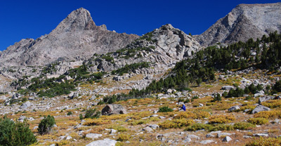 We were back in camp by 2:40 and decided we would hike off trail to a small lake SE of the south end of Maes Lake. We found a campsite and fire ring up in there, and I guess it would be a fine place to get away if the hordes were out at Maes Lake. But the views were nowhere near as good. Dinner was some Lipton veggie side dish with dried tuna in it. It was OK, but it is worthwhile to note that we did not take it on our next long backpack, the 2008 Canyon trip. We eventually threw in the towel, acknowledging that we were tired of the wind, and decided to go in tentia at 6:30 pm. The high temp for the day had been 52 degrees. Fine in the sun, with no wind, but cooling otherwise. Both of us had taken a book and while it was another evening of achingly blue skies, we had endured the wind long enough today. Certainly, it was a small price to pay for the scenery. Susie wanted to zip our sleeping bags together. Both of us had our feathered friends bags on this trip. However, her's is a barrel bag and mine is a mummy. It felt a little weird, but good to be close to each other.