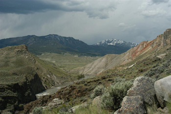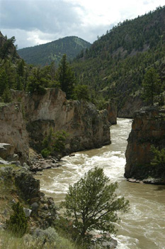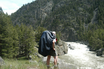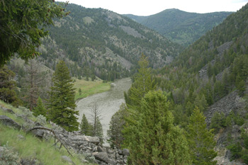 I was so ready for a backpack that we rolled out of the driveway nary 5 minutes after our good friend, Barbara from Knoxville, her ex-husband Tom (let's not go there), and grandson Tyler had backed out, following a short visit prior to their sightseeing/backpacking trip to Yellowstone and Grand Teton NP. Susie and I headed for the Mammoth Hot Springs entrance to the Park, the Hot Springs seeming to me vastly less mammoth than they were merely 13 years ago. Stuffed in the back of our van was the multi-page 11 x 17" print out of rules, regulations, and backcountry campsites for Yellowstone NP. The impression one has after pouring over such a missive is that the Park, likely from a liability standpoint (that said by someone who works with lawyers and has a deep affection for them), would just as soon you DON'T want to go backpacking. I had read through the Byzantine list of regulations, and it seemed that, if there were not TOO many people backpacking in the north side of the Park this weekend, we might be able to get ourselves a permit to take a hike in this Park. Our plan was to start near the town of Gardner, nearly the lowest elevation in the Park, and head upstream along what is called the Black Canyon of the Yellowstone River for 9 miles or so, turn upstream to the south to leave the canyon, and ultimately spend a second night along Rescue Creek, before heading back to Gardner on the third day. Susie and I discussed the proposed route with the ranger at the backcountry desk a fair amount, and agreed that we would expend the major effort on this first day, getting as far up the river as we needed to go, have an easy second day, and be out of the Park in early afternoon on Day 3, to have dinner with our now-friends Patti and David in Bozeman that evening. Permit in hand (or wallet, actually), we drove back down the road to Gardner, ready to start the trip on the river's south side, just out of town.