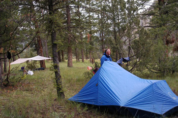 I tried to keep warm in the tent without unpacking my sleeping bag. Not very successfully. We sorta dozed and listened to the pitter patter of rain on the fly. I was way ready for dinner, but Susie, understandably, was not very enthusiastic about cooking in the rain, nor under the fly (certainly not in grizzly country), and suggested we have some granola bars and call it a night. Well, I might have been tired, but we were not that far away from the solstice, and we had many hours to go before dark. In my head, I had been counting the duration of the showers, and most of them did not last more than 20 minutes. Just enough to give you a good soaking if you are outside, so I figured we had another 10 minutes to wait, until I could get out and set up our tarp. In another 10 minutes, as the rain was halting, I told Susie it was nuts to worry about carrying a wet tarp tomorrow, when we could enjoy a small piece of dry ground this evening, and that I was headed out to set up the tarp and begin dinner.